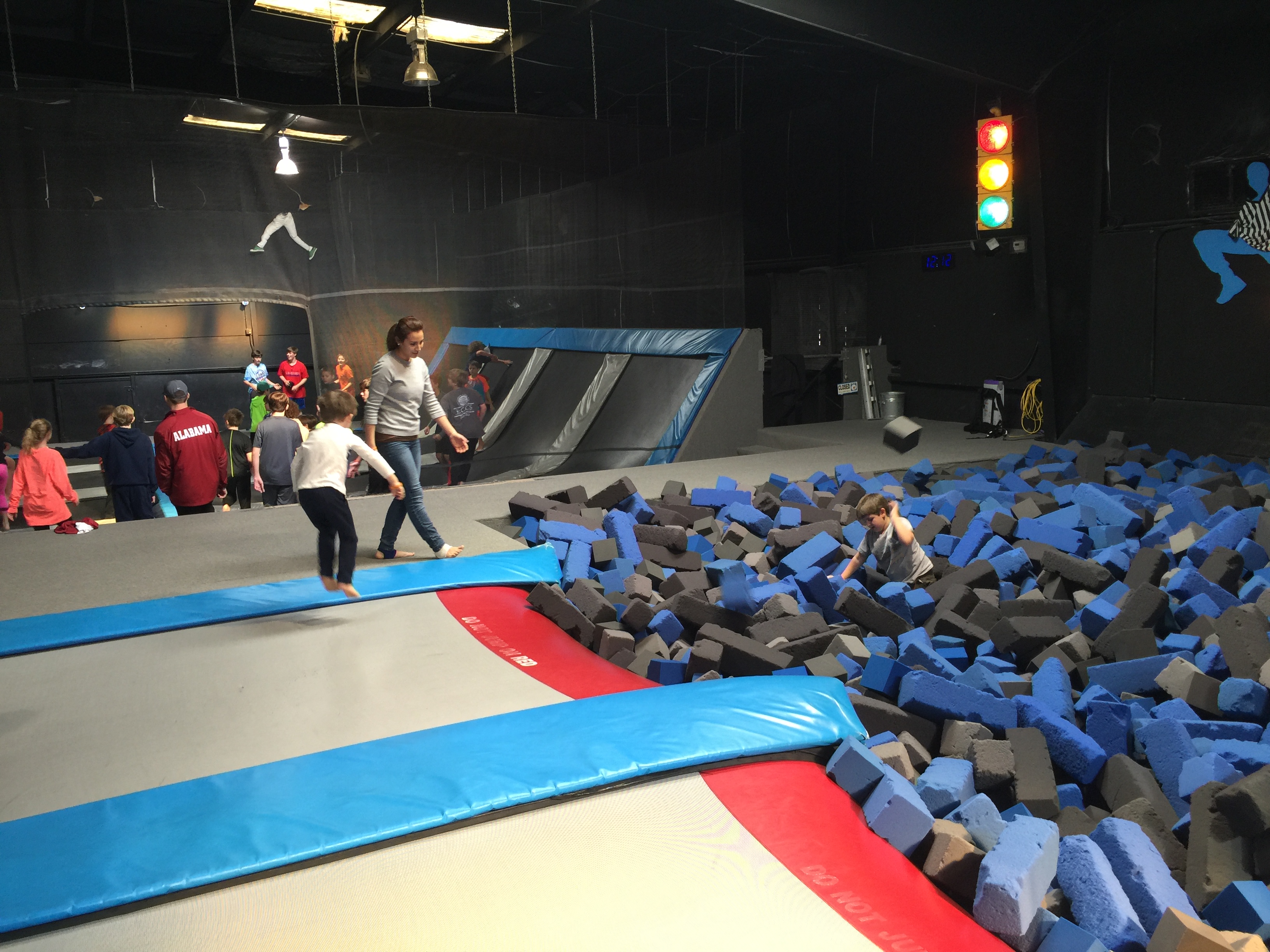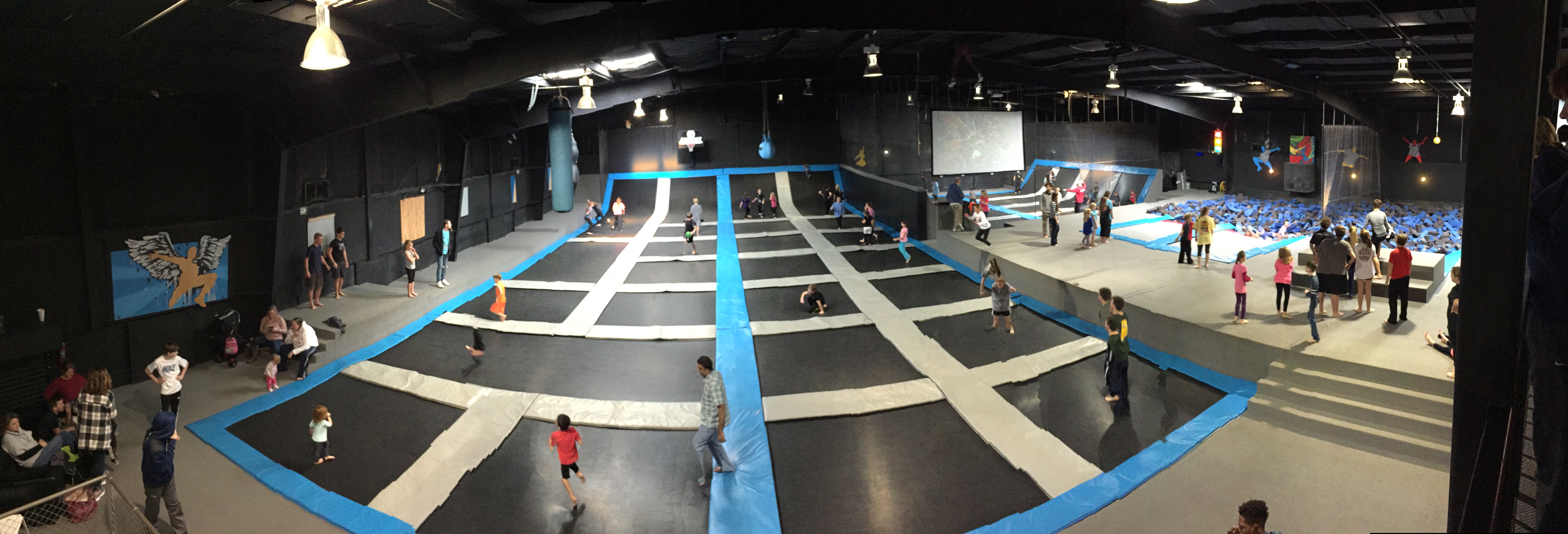 My kiddos LURV Airwalk. I like to take them there on those days when they are climbing the walls like rabid spider monkeys. They can jump and climb until their little legs turn to Jell-O. There are trampolines all on the floor and up the walls, a pit full of foam to jump into, and a dodgeball tournament area. Parents can sit and chill at a second story seating area (there are a few snack and soda machines up there) overlooking the play area. Or parents can sit at the bottom to watch the kiddos more closely (or get some pics).
