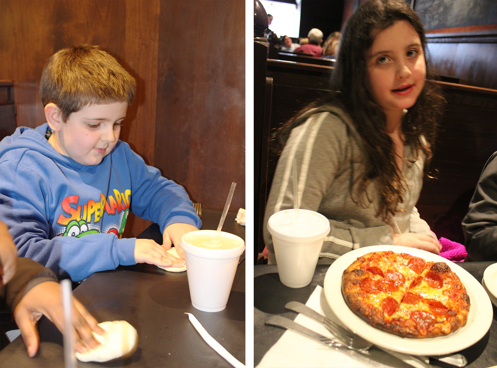 Below: There is a wait for the food, since it is so fresh. The waitress was very nice and brought the kids a small ball of pizza dough to play with while we waited. The kids had so much fun with that dough. They ordered pepperoni and cheese kid’s pizzas (only $4!) and they loved them!