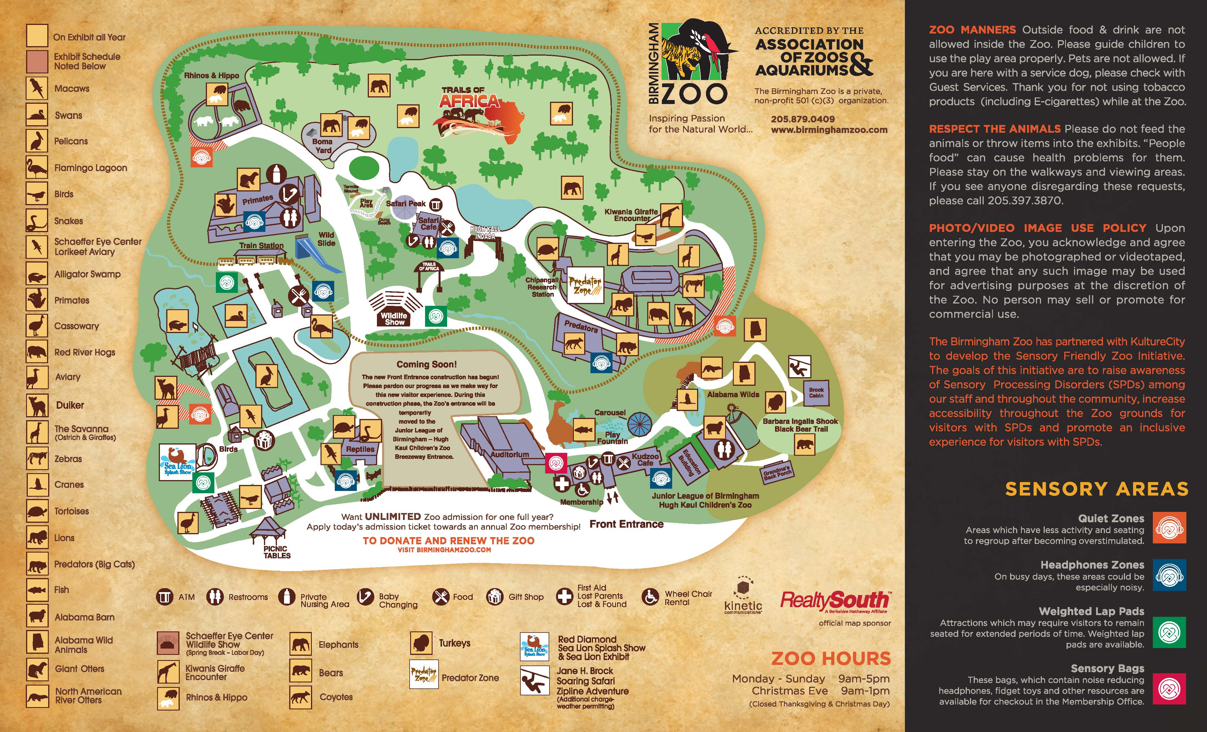 The Birmingham Zoo is currently under some renovations. Here is a current map showing the new entrance and location of the animals and activities.