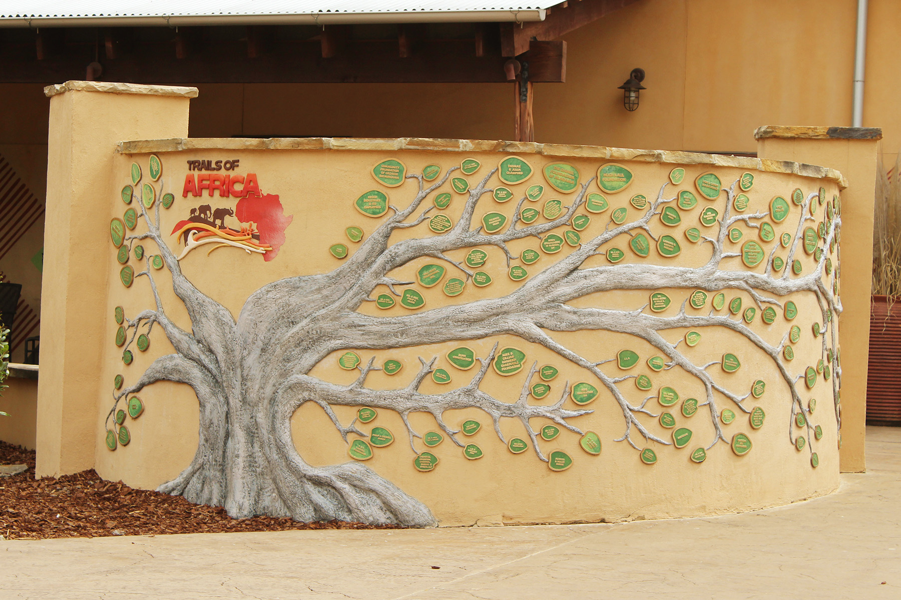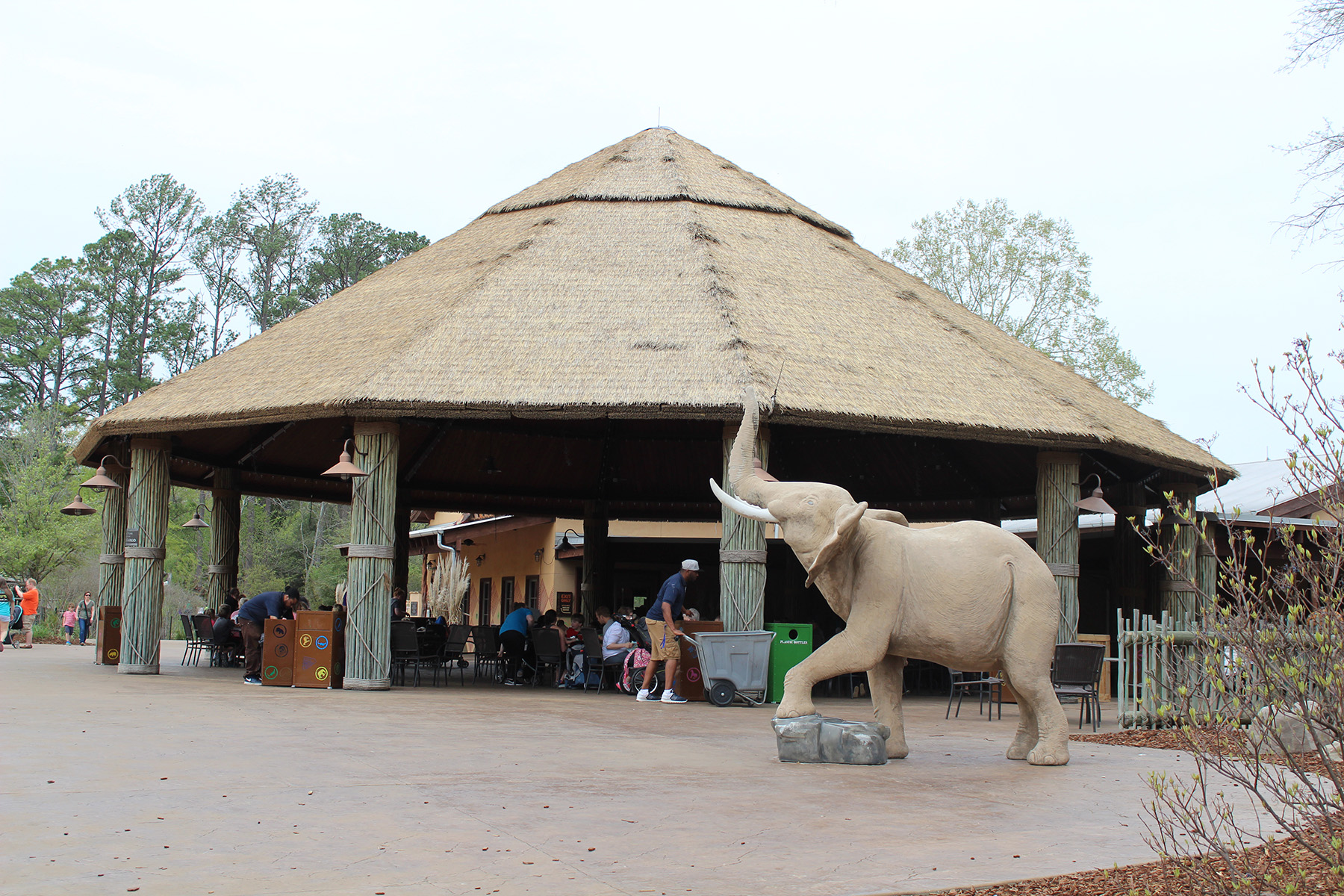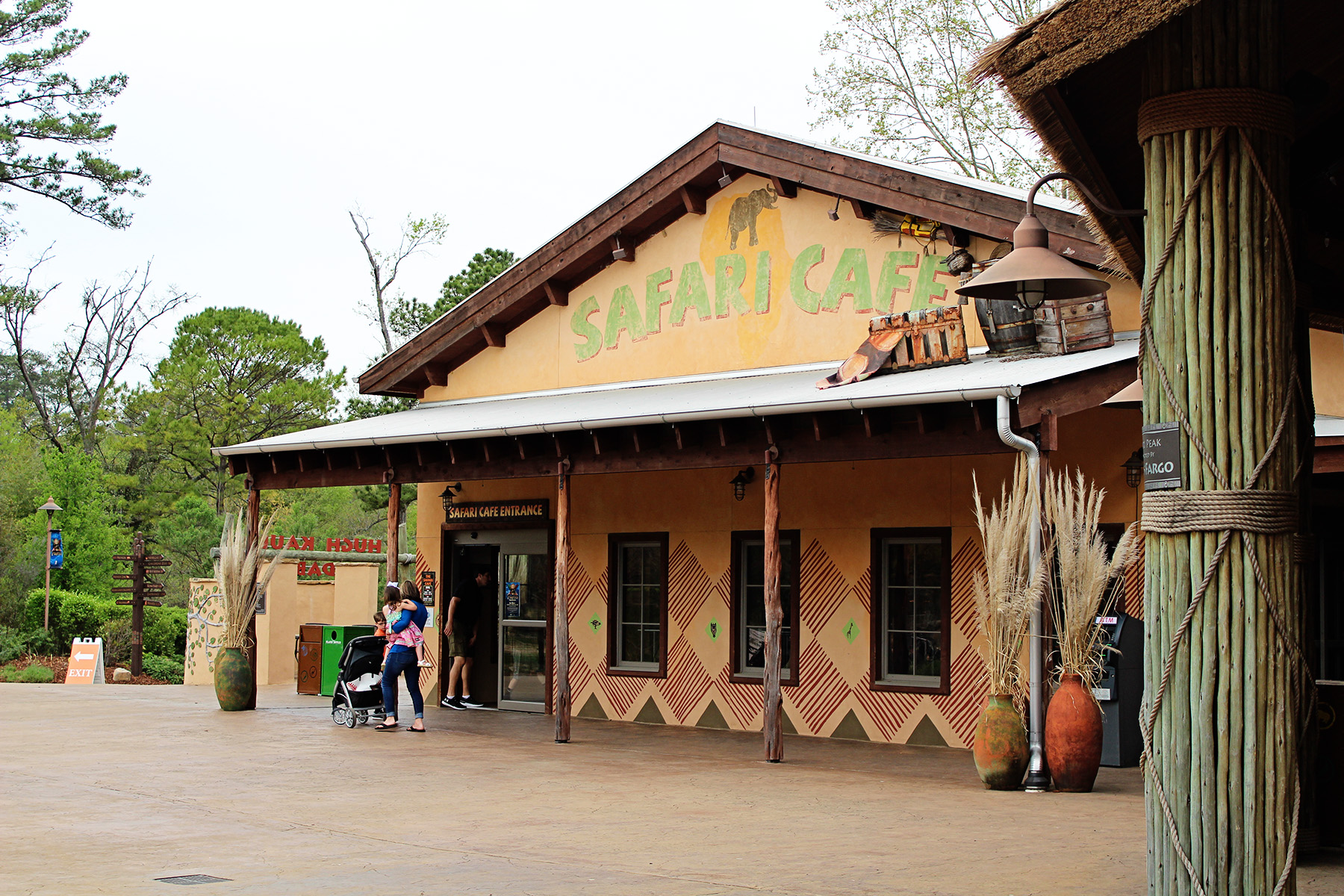 The Trails of Africa includes the Boma Yard/Elephants, The Kiwanis Giraffe Encounter, and an area with Rhinos and Hippos. The Safari Hut Café and a small play area are located in this area.