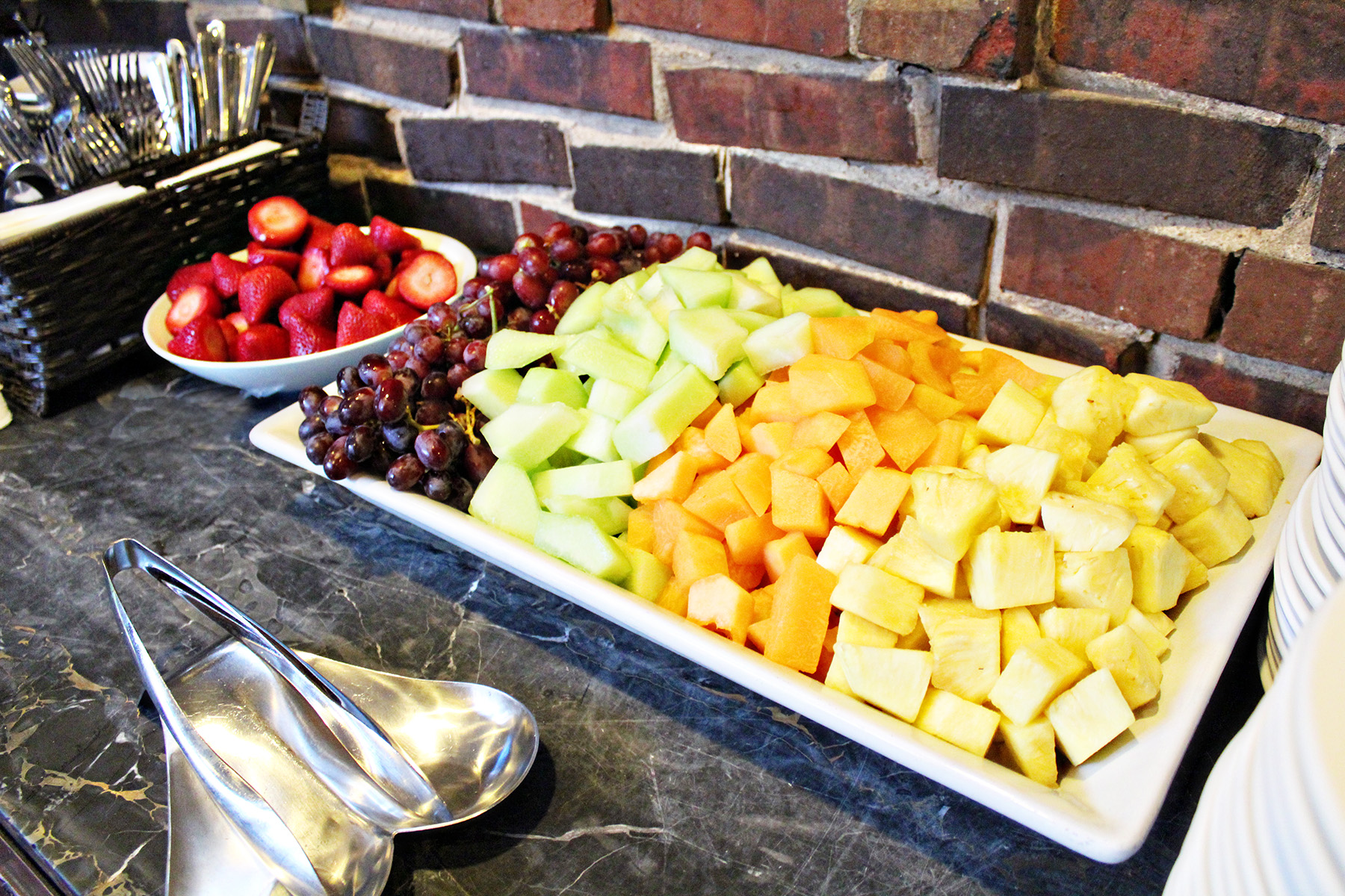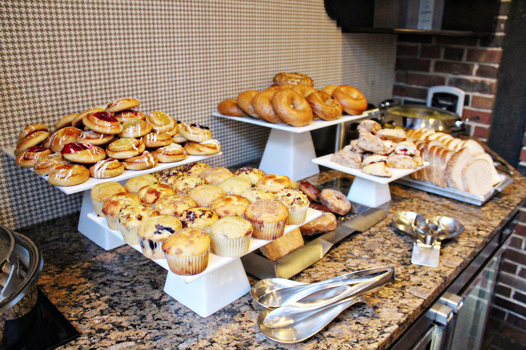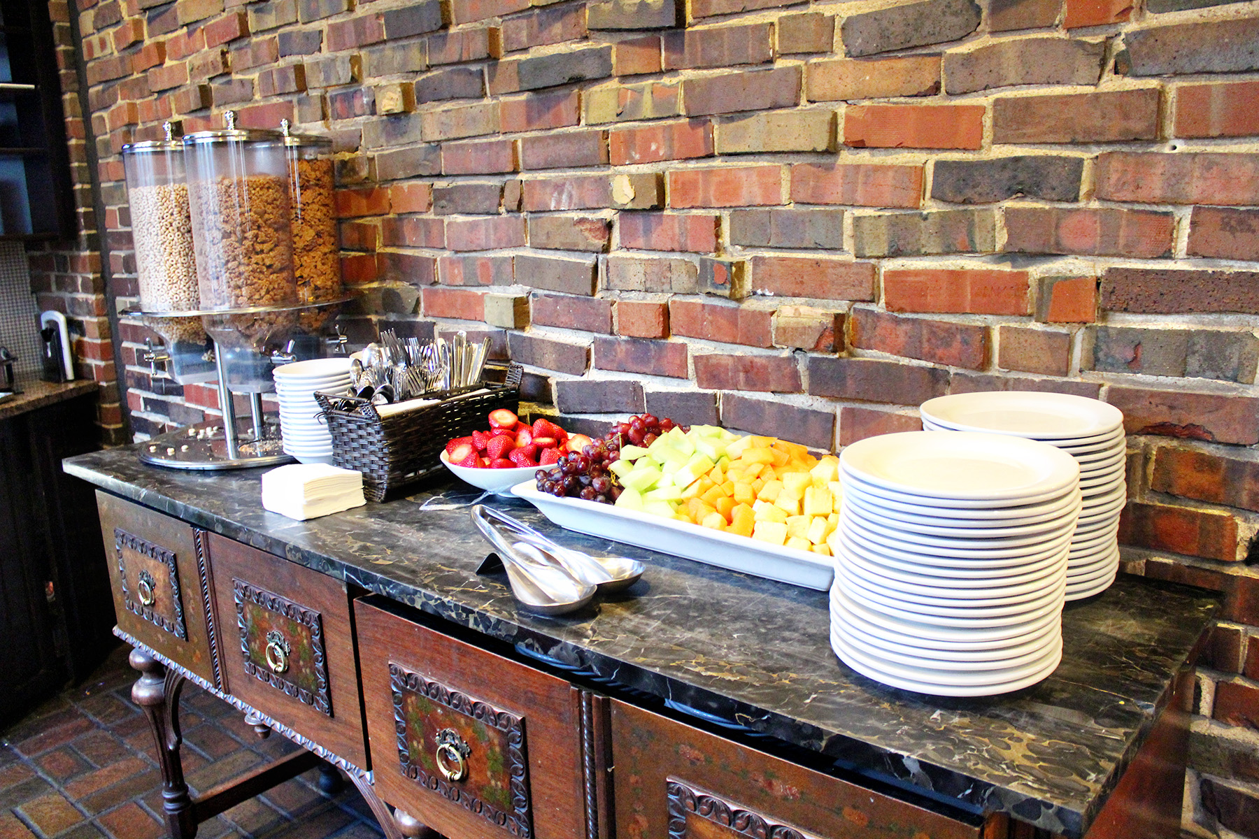 The Cheshire offers a generous, complimentary breakfast that includes fresh fruit, yogurt, parfaits, hot and cold cereals, juice, milk, doughnuts, muffins, and croissants. Breakfast options include open face English Muffin sandwiches, hash browns, and sausages. My favorites were the fresh fruit and the cheesy eggs!