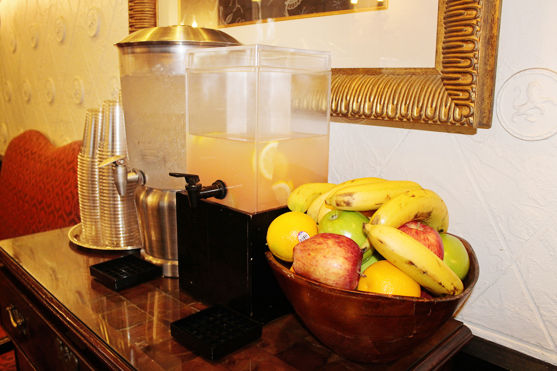 Guests are also welcome to help themselves to the 24/7 ice water and lemonade station (with a bowl of fruit). It is also complimentary for all hotel guests.
