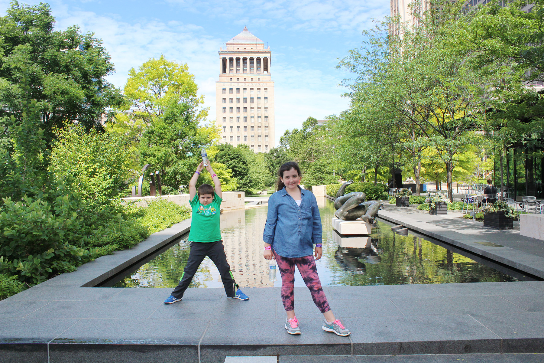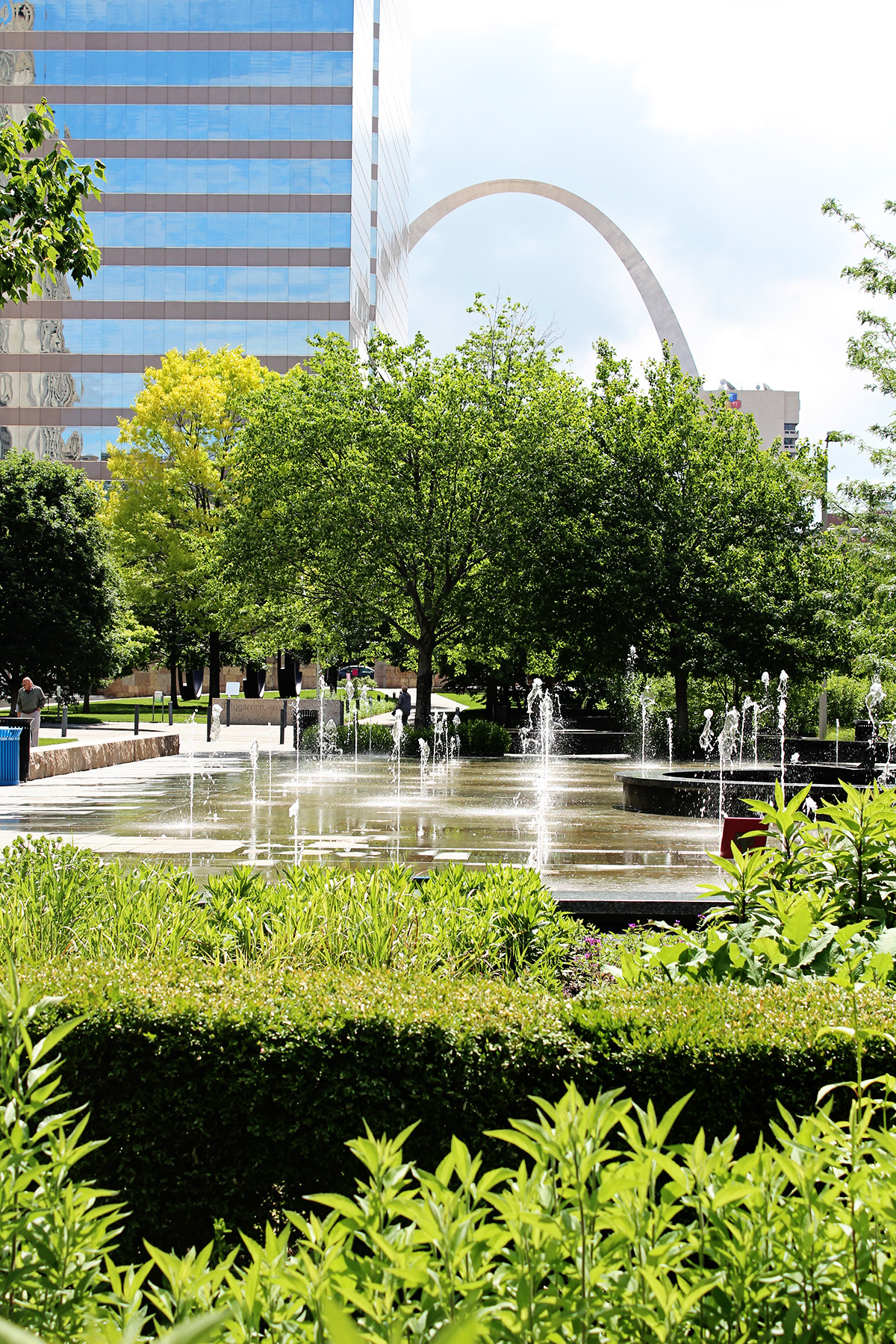 After a really fun visit to City Museum, we headed over to Citygarden which is located right in the heart of downtown St. Louis. This park is about a 5-minute walk from the Arch and is FREE to enter. There are lots of open areas for children to run, walk, and play. In addition to waterfalls and splash pads, the garden also offers plenty of shady spots to sit and relax.